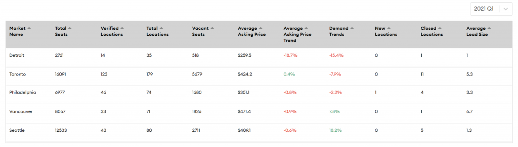 Amidst an overall positive outlook for coworking trends, gradual national recovery and spiking demand for coworking and flexible space in key markets, there are still some markets where the effects of COVID-19 are not over. The 5 North American markets with lowest coworking demand are Detroit, Toronto, Philadelphia, Vancouver and Seattle.